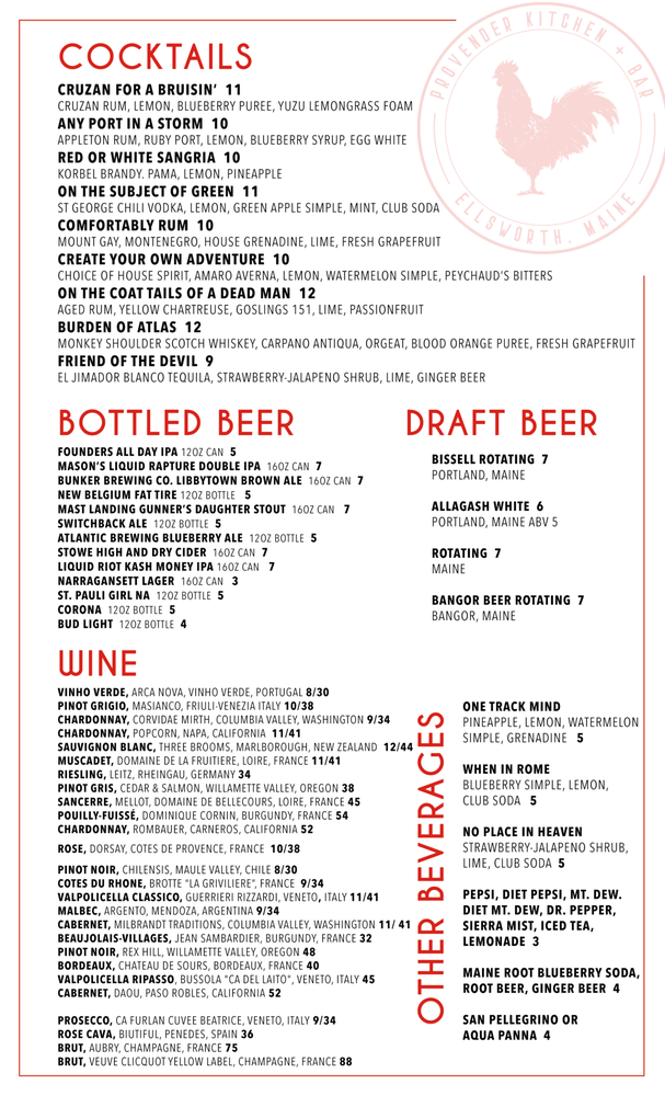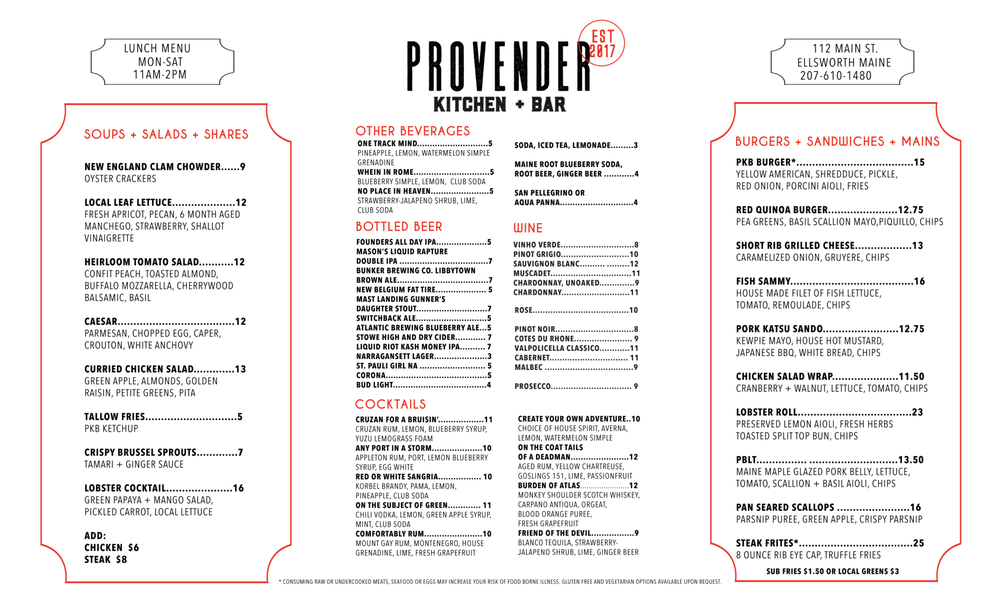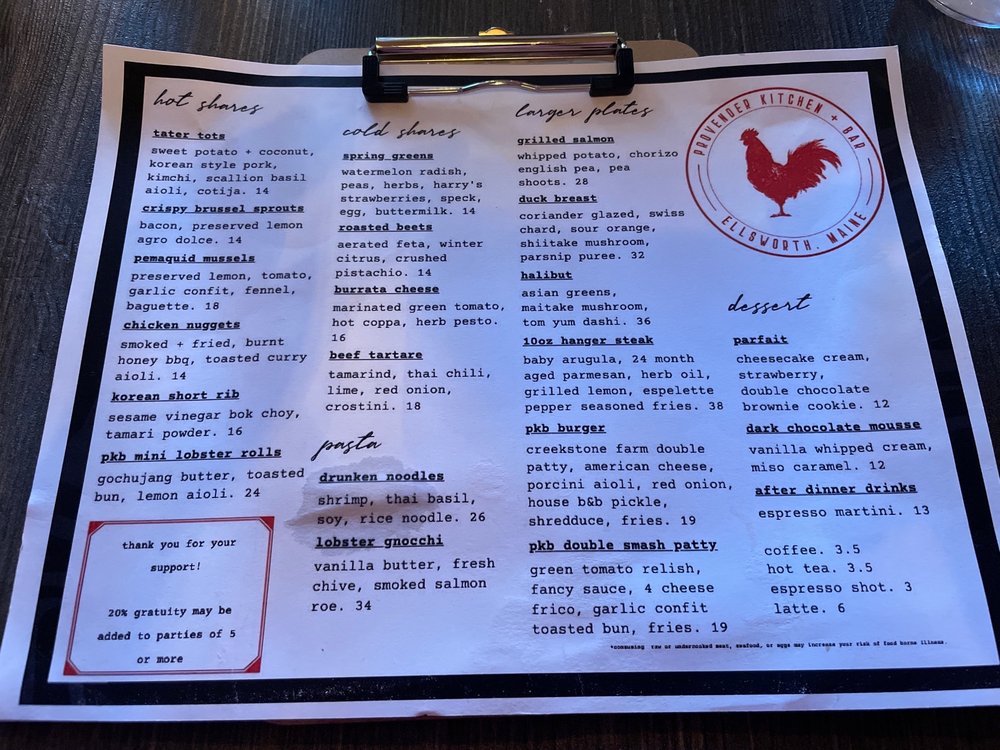 Introducing the menu at Provender Kitchen + Bar is an exploration of vibrant flavors and local ingredients in a cozy setting. Located in downtown Ellsworth, ME, this New American eatery seamlessly blends innovation with comfort. Start your culinary journey with the Crispy Brussels Sprouts dressed in a zesty ginger-tamari or the rich Chicken Liver Parfait complemented by cherry jam. For mains, the Feta-Crusted Halibut stands out, offering a delightful fusion of textures and tastes. Meanwhile, the renowned PK Burger is a must-try, featuring house-made porcini aioli and served with perfectly seasoned fries.